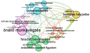 A hálózatban a csomópont (kompetencia) mérete a kapcsolatainak számát jelöli, a vonalak vastagsága pedig az adott kapcsolat erősségét. A tartalmilag összetartozó csomópontokat azonos színnel jelöltük.