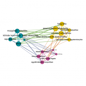 A hálózatban a csomópont (kompetencia) mérete a kapcsolatainak számát jelöli, a vonalak vastagsága pedig az adott kapcsolat erősségét. A tartalmilag összetartozó csomópontokat azonos színnel jelöltük.